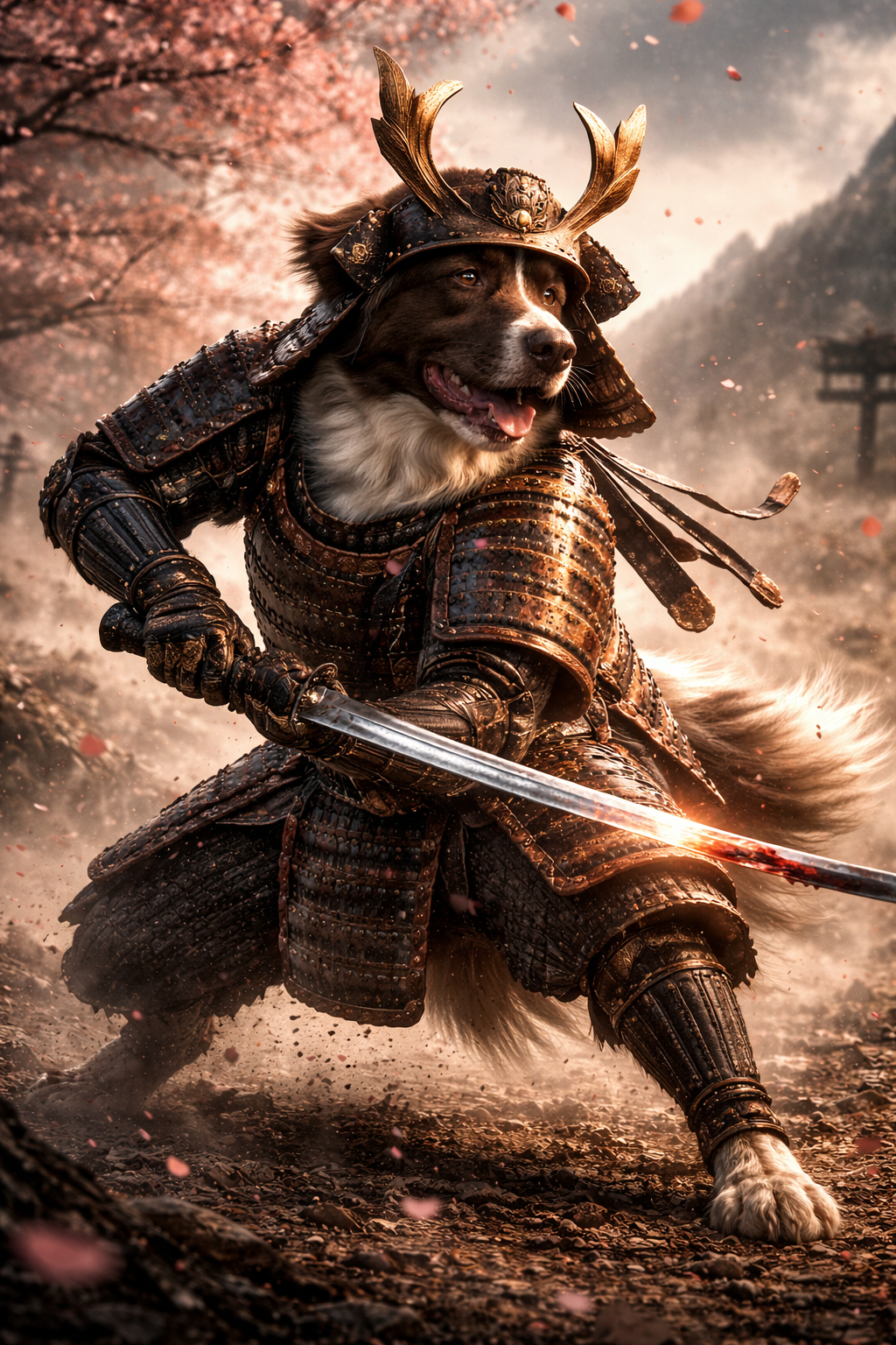 – Dramatic cinematic lighting highlights the dog: warm golden glow across its face and chest, subtle reflections in the eyes.